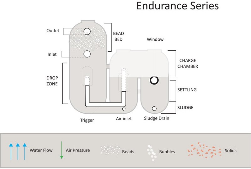 The water moves from the inlet up through the bead bed. The bead bed provides surface area for the water purifying bacteria and captures solids within the aquatic system. Air is slowly injected into the charge chamber, gathering in the top of the filter. As more air enters, this places downward pressure on the water level. The water level drops trapping water in the settling zone, and solids from the last backwash settle into the sludge basin. The rate of air injection controls the length of time between backwashing events.