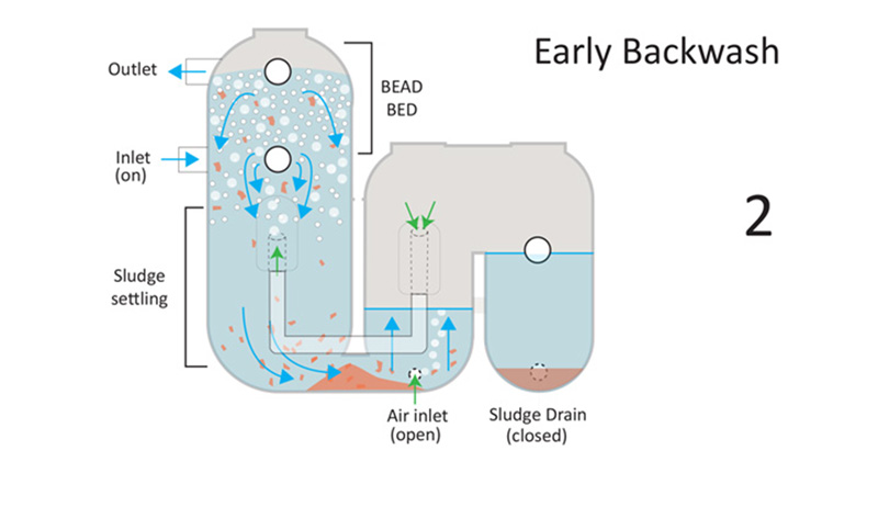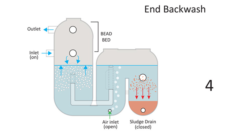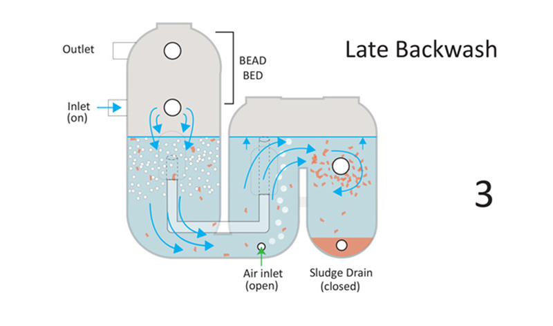 Air has made its way through the trigger into the bead bed. The bubbles agitate the beads; knocking solids and biofilm off the beads. As the air pressure in the charge chamber drops, the dirty water from beneath the bead bed sweeps through the chute carrying the solids into the adjacent compartment. No water flows out of the filter during the short 3 – 5 second backwash event; instead the dirty backwash water is captured in the charge chamber and the sludge basin. The beads float in the drop zone where they continue to be scrubbed by the escaping bubbles.
