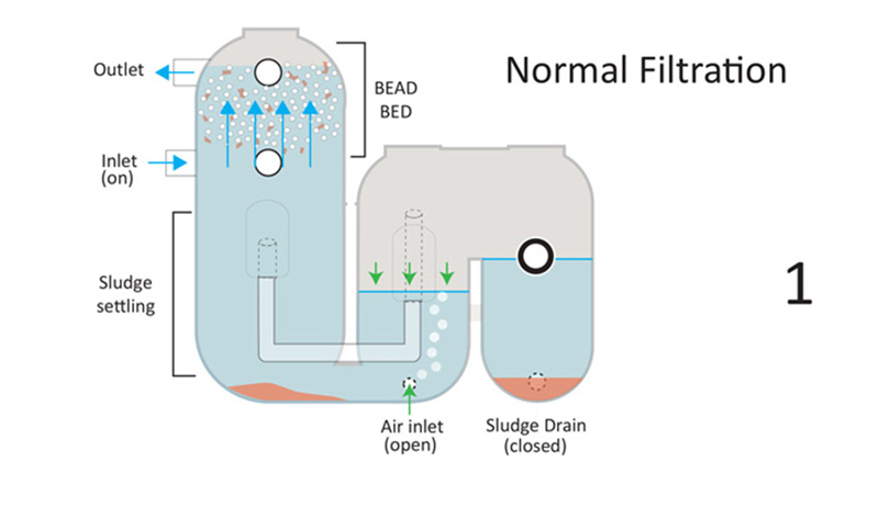 Eventually the water rising in the sludge chamber floods the trigger, bringing water movement in the charge chamber and sludge basin to an end. Trapped solids begin to settle as the filtration chamber is refilled with the water from the inlet. The beads float back in place to reform the bead bed. As soon as the water rises to the outlet, filtration resumes.