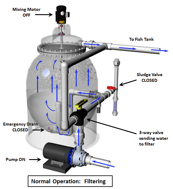 Utilized at some of the largest recirculating fish production facilities, zoos, and aquariums, these units accept versatile loads ranging from low to high solids due to the active motorized backwash system. The motorized embedded propeller is used for frequent washing of the media, removing captured solids and excess media biofloc. The sludge then settles to the bottom of the unit where it is drained, reducing water loss that is normally associated with backwash processes. With Propeller Bead filters, you will only lose 10% of the water you that you would normally lose with run-of-the-mill sand filters.